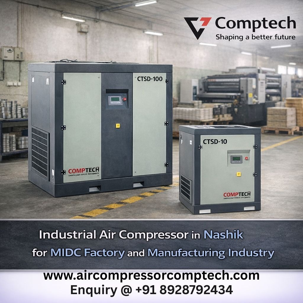 Comptech Compressors supplies industrial screw Reciprocating Piston air compressors in Nashik, Satpur, Ambad, Sinnar, Ojhar, Dindori, Igatpuri, Trimbakeshwar, Pimpalgaon and Niphad for MIDC factories, engineering units and manufacturing industries.