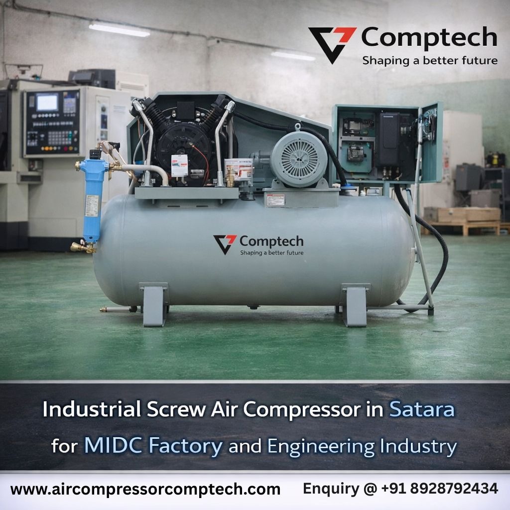 Comptech Compressors supplies industrial screw air compressors in Satara, Karad, Phaltan, Koregaon, Wai, Lonand, Shirwal, Patan, Khandala and Medha for MIDC factories, engineering units and manufacturing industries.