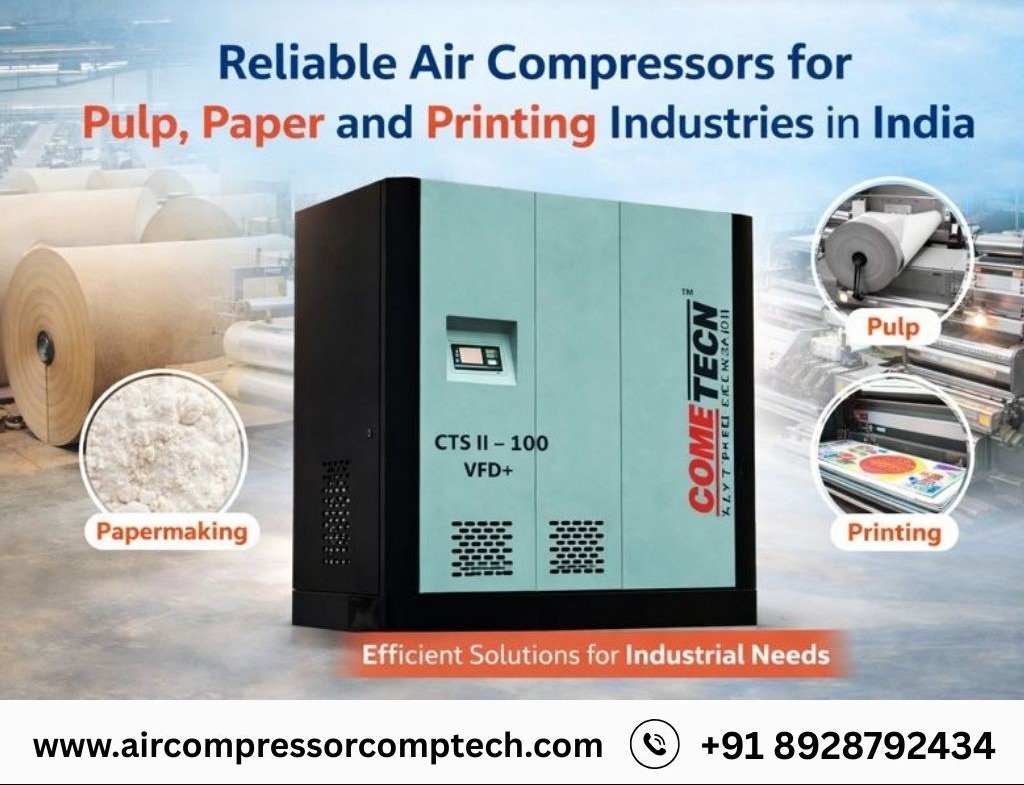 Comptech Air Compressors provides sales and service across India, including Nagpur, Kolhapur, Rajkot, Ludhiana, Indore, Jaipur, and Hyderabad, supporting pulp, paper, and printing units with reliable compressed air solutions.