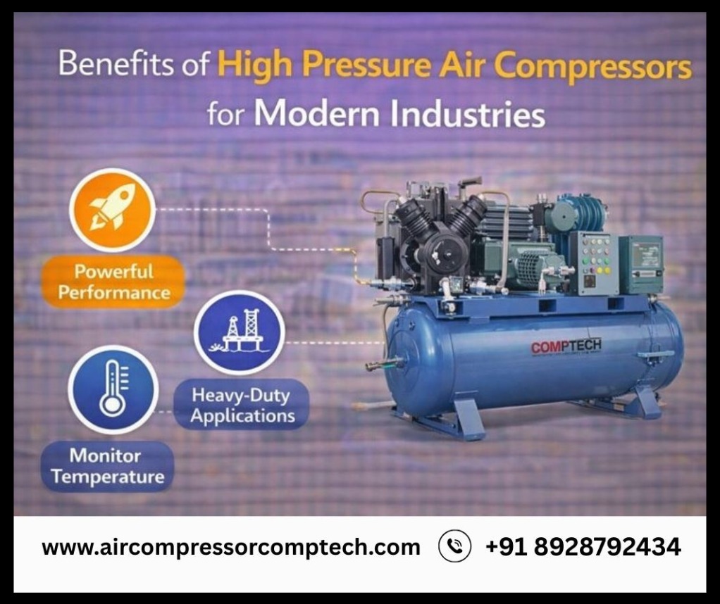 Comptech high pressure air compressors are designed for Indian industrial conditions. They offer stable pressure, strong build quality, and easy maintenance, making them suitable for demanding environments.