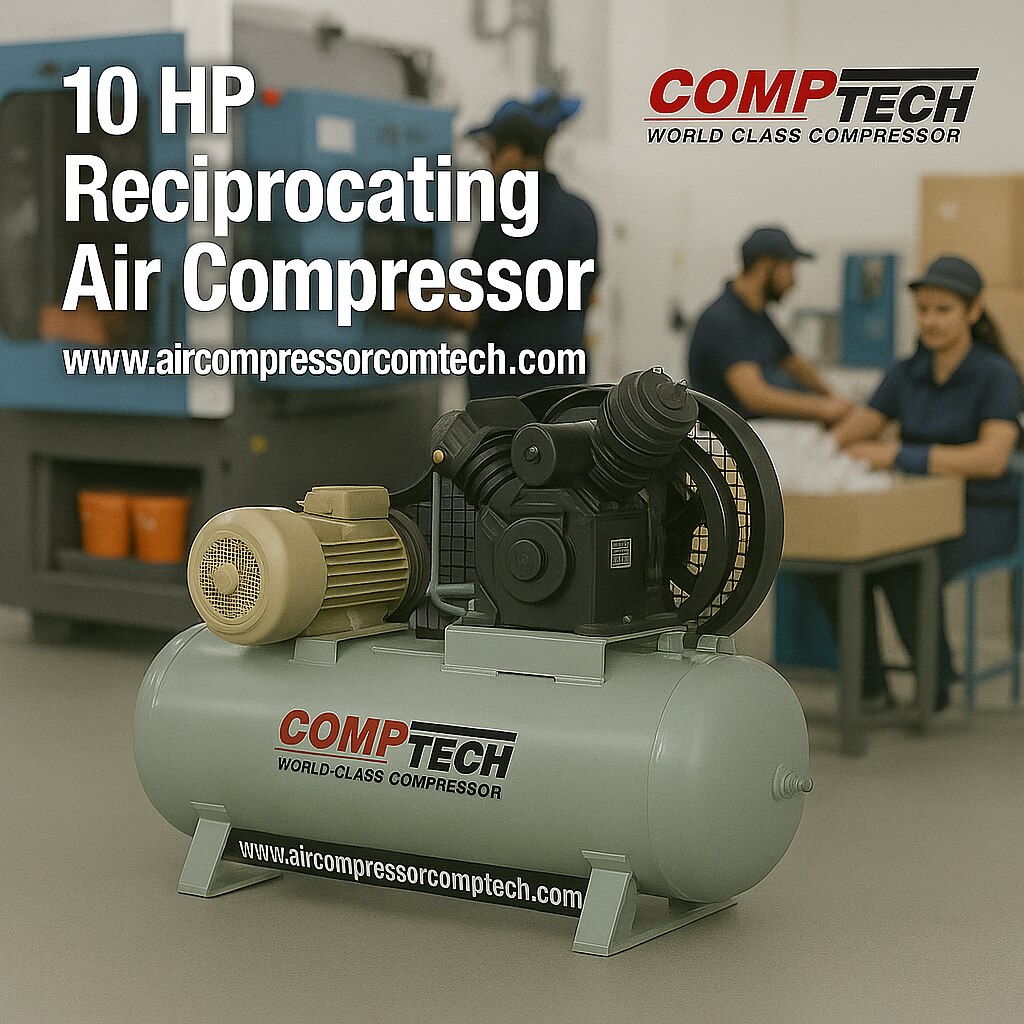10 HP Reciprocating Air Compressor. Horse Power : 10 HP Compressor Technology : Reciprocating Compressor Brand : Comptech Air Tank Capacity : 500 Litre Number Of Compression : Stages 2 Compressor Speed : 880 rpm Maximum Pressure : 12.3 kg/cm2g Warranty : 12 months Number Of Cylinders : 2 Power Source : Electric Air Receiver with 10 HP Standard make Motor and DOL starter, complete package ready to start. Dry type Suction Air filter with silencer. Auto starts and stops system. V-belt Drive arrangement. Receiver fittings: Service valve, Safety valve, Drain valve, Pressure gauge, Belt guard.