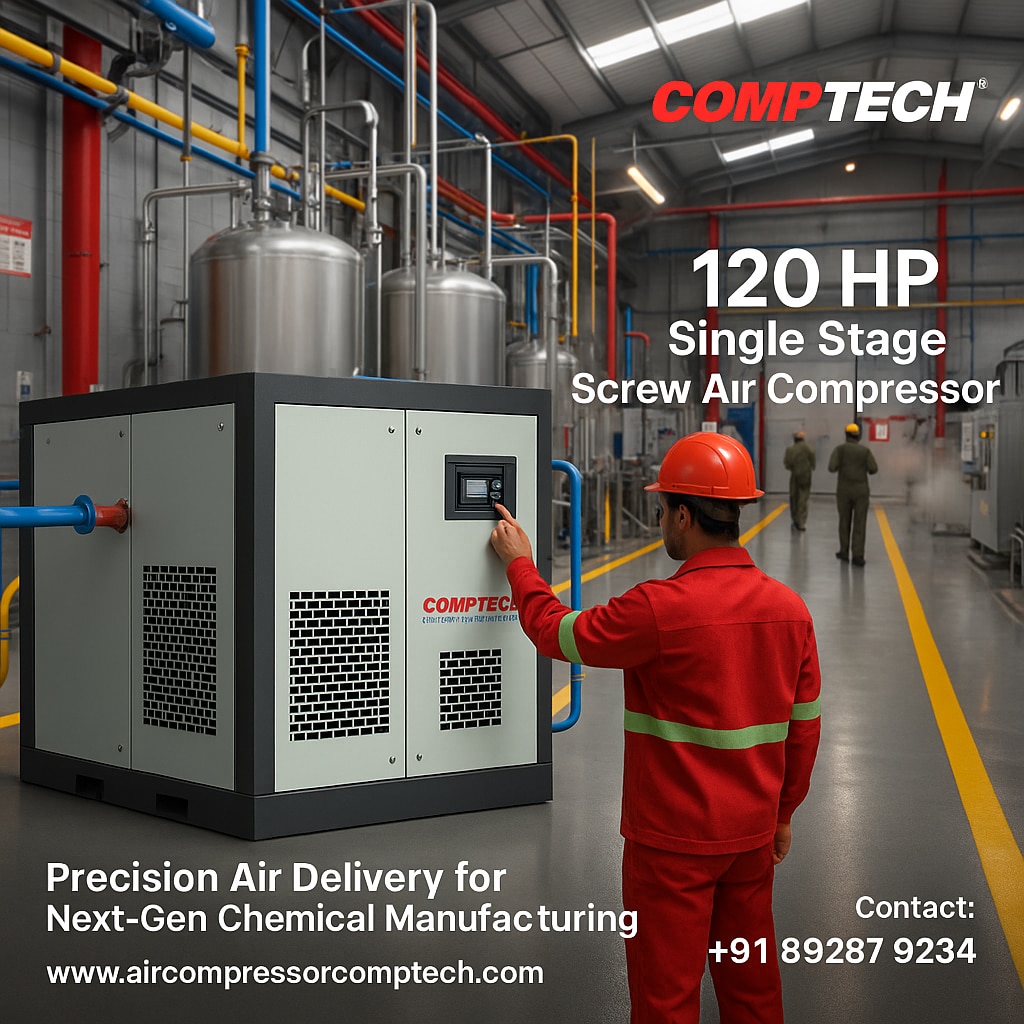120 HP Direct Driven Single Stage Screw Air Compressor Our 120 HP Direct Driven Single Stage Screw Air Compressor available in Standard Fix Models. We use PM Motor with our VFD Models, which decrease the energy consumption substantially to save even more energy as well as money. Features: • Super premium efficiency IE4 PM motor • Vibration free quieter operation • Designed for hot indian climate • Service friendly design • Direct drive with low rpm • Advance PLC for easy operation • Lowest oil carry over • Lowest life cycle cost Technical Specifications – 120 HP Screw Air Compressor (Model: CTSD 120) Horse Power : 120 HP Power Source : AC Three Phase Model Name/Number : CTSD 120 Number of Compression Stages : Single Stage Weight : 1900 kg Compressor Technology : Screw Compressor Dimension : (L × W × H) 79 x 58 x 70 inch Warranty : 12 Months Cooling Method : Air Cooled Compressor Speed : 2900 RPM Brand Name : Comptech Sound Level : 76 dB FAD Capacity : 554 CFM at 8 kg/cm², 543 CFM at 10 kg/cm²