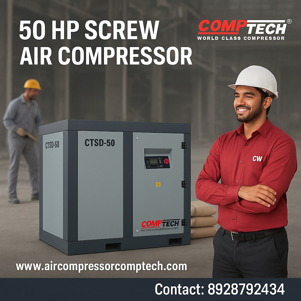 50 HP Screw Air Compressor Horse Power : 50 HP Brand : Comptech Model Name/Number : CTS II 50 Compressor Noise Level : 73 dB Number Of Compression Stages : Two Stage Compressor Technology : Screw Compressor Warranty : 12 months Cooling Method : Air Cooled Air Quality Standard : Class I Compressor Speed : 1450 rpm Working Pressure : 5 bar g FAD Capacity : 326 cfm A 2-Stage Screw Air Compressor Series designed to enhance the profitability of your production. The regulated speed models, or VFD+ models, save energy by matching the output to the plant's air demand, with the added benefit of high-efficiency internal Permanent Magnet Motors, ensuring no loss of efficiency. Other Details: Equipped with VFD & IE4 PM Motor Features: Best-in-class efficiency Premium efficiency 2-stage air-end Longer lifespan due to low motor RPM Available with super-premium options Low noise and minimal vibrations Lowest cost of ownership in the market 50,000 hours bearing life Specifications: Working Pressure: 8 bar g, 10 bar g FAD Capacity: 258 cfm, 234 cfm