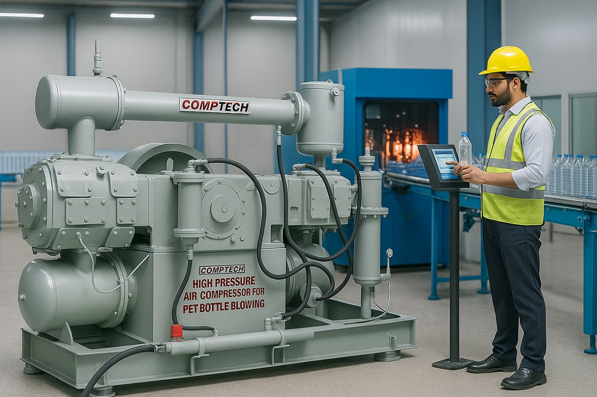 50 HP Oil free high pressure air compressor Lubrication Style : Oil Free Cooling System : Water Cooled Maximum Pressure : Upto 42 Bar Maximum Discharge Pressure : Upto 42 Bar Brand : Comptech Usage/Application : Pet Industries Compressor Mounting Configuration : Skid/Base Plate Mounted Cooling Method : Air Cooled Maximum Flow Rate(CFM) : 85 CFM to 2665 CFM Country of Origin : Made in India Specification 100% OIL FREE & LUBRICATED COMPRESSORS. DOUBLE ACTING WATER COOLED, RUGGED CAST IRON DESIGN, IDEAL FOR HEAVY DUTY & CONTINUES OPERATION. LOWER OPERATING COST, SIMPLE MAINTENANCE. EASY ASSESSABILITY OF SPARES AT ECONOMICAL PRICE